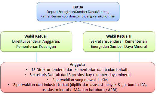 Diketuai oleh Menteri Koordinator Bidang Perekonomian, anggota tim ini terdiri dari Menteri Energi dan Sumber Daya Mineral, Menteri Keuangan, Menteri Dalam Negeri, Kepala BPKP, dan Prof. Dr. Emil Salim. Tim Pengarah bertugas menyusun kebijakan umum transparansi pendapatan negara dan pendapatan daerah yang diperoleh dari industri ekstraktif.